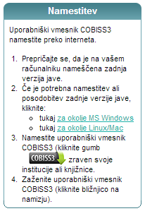 Na spletni strani COBISS3 v oknu Namestitev v točki 2 izberemo povezavo za okolje